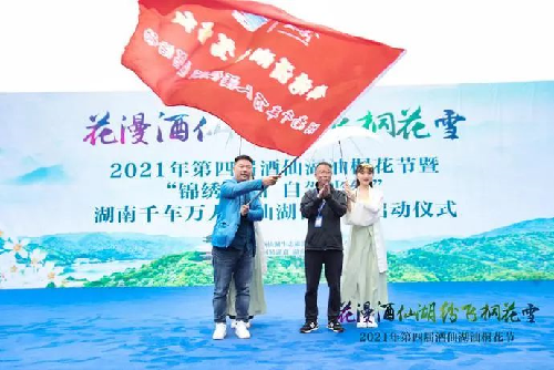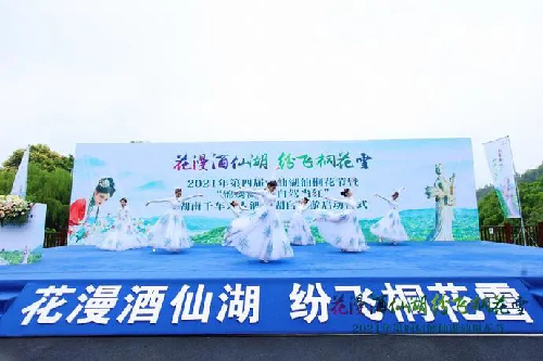 近年来,通过持续打造“油桐花”旅游品牌,酒仙湖景区已成为亲子自驾、情侣出游的热门旅游景点,网红打卡热度直线飙升。开幕式现场,湖南国信建设集团股份有限公司党委副书记、总经理吴立新表示:“今年的桐花节是酒仙湖公司举办的第四届桐花节节会活动。我们要借助过去的成功经验,进一步精心筹划,进一步注重细节,进一步改善环境,进一步提高服务质量。”
