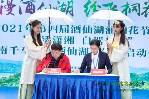在当天开幕式现场,酒仙湖景区与湖南省自驾旅游协会签署了“湖南千车万人酒仙湖自驾”战略合作协议。未来双方将强强联手打造集游山、玩水、赏花为一体的优质自驾旅游线路,进一步完善景区旅游线路布局,让酒仙湖成为长全省的自驾游热点。谈及本次合作,湖南省自驾旅游协会会长杨国林表示:“协会希望通过合作持续挖掘攸县旅游文化,推介攸县旅游市场、提升旅游知名度,拓展湘赣客源市场,未来带领更多自驾游客走进攸县,走进酒仙湖。”