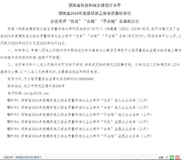 根据《湖南省建筑施工安全质量标准化考评实施细则(试行)》(湘建建〔2023〕122号)相关规定,湖南省住房和城乡建设厅对全省建筑施工企业进行了全面、严格的综合考评,并最终确定了“优良”、“合格”、“不合格”企业名单。此次考评结果已于2025年10月17日至10月24日进行公示,我公司荣列 “优良” 榜单。