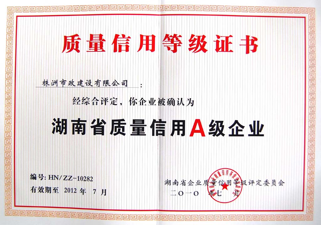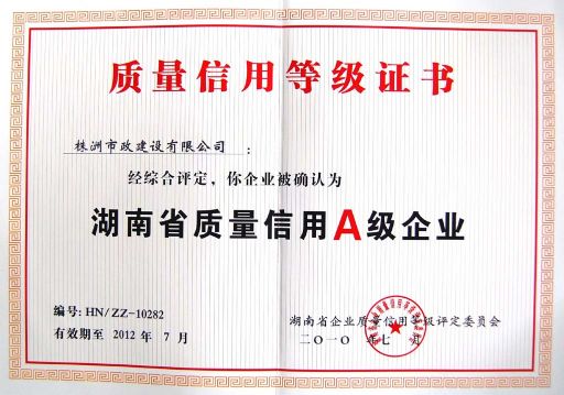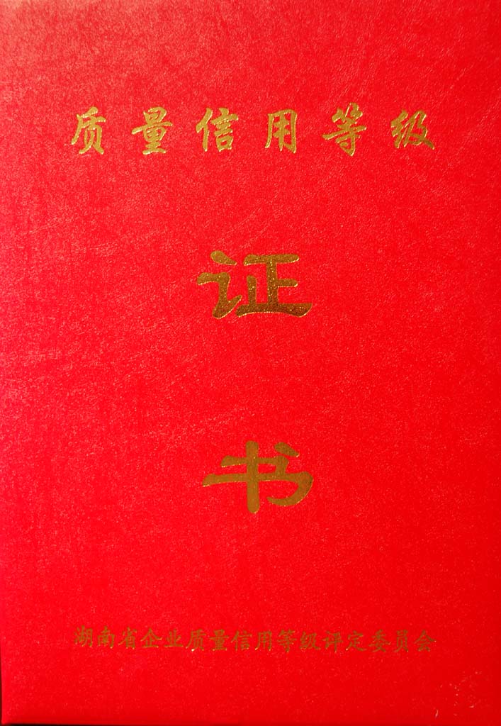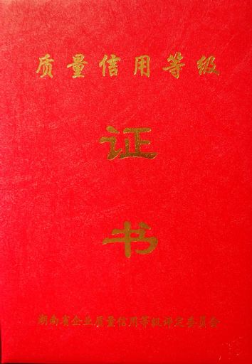 2010年7月,我公司经湖南省企业质量信用等级评定委员会综合评定,被确认为“湖南省质量信用A级企业”。
