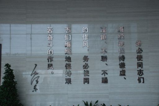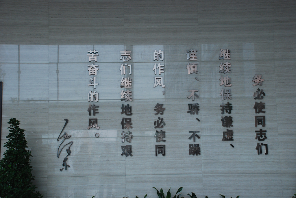 进入大厅,首先印入眼帘的是伟大领袖毛泽东同志关于廉政反腐的一段话:务必使同志们继续地保持谦虚、谨慎、不骄、不躁的作风,务必使同志们继续地保持艰苦奋斗的作风。