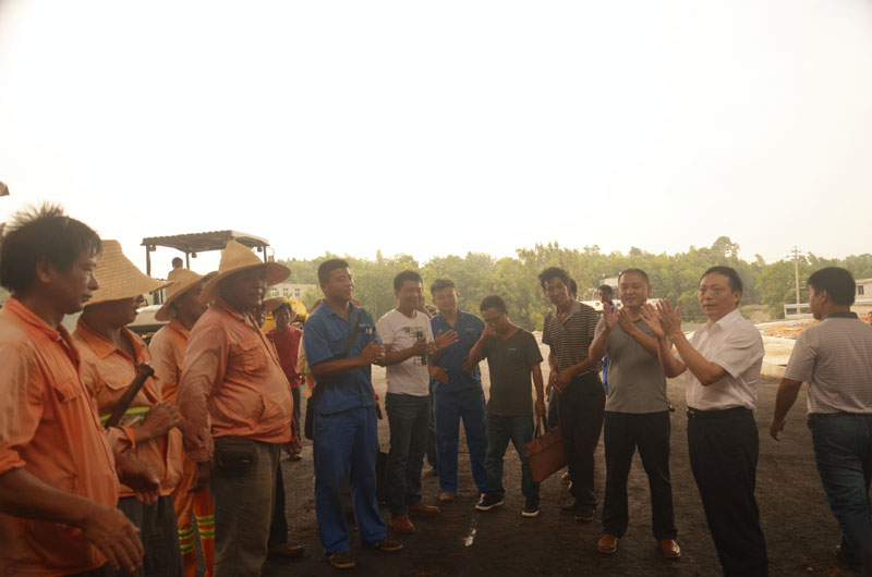 在工地现场,肖和政董事长与沥青公司负责人刘建新进行了亲切交流,详细了解沥青公司在“百日攻坚战”期间,各个项目工程的进度、管理以及设备调度等方面的情况,并对相关重要环节提出了严格要求。肖和政董事长与现场的沥青公司干部职工以及农民工朋友一一握手,并传达了公司的关怀和问候:今天是中秋佳节,向此时此刻仍奋战在一线的各位干部职工以及农民工朋友,致以节日的问候。我们施工企业不仅要确保工程的安全和进度,同时还要注重质量和品牌意识。在“百日攻坚战”的东风下,发扬市政人的“铁军”精神,圆满完成各项施工任务。