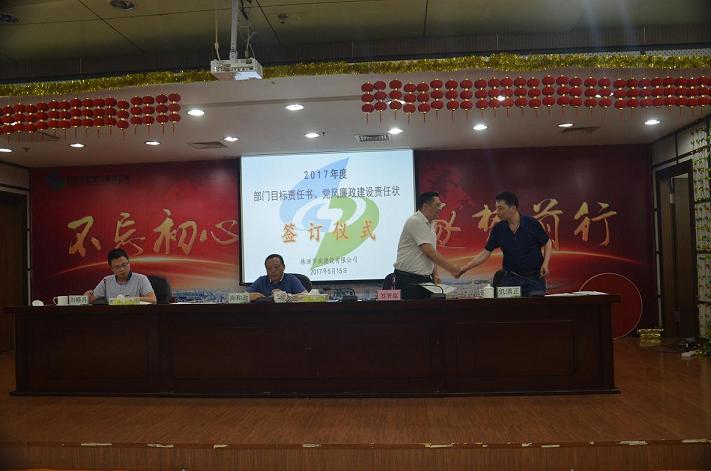 在与会人员的见证下,公司董事长、党委副书记肖和政代表公司与各部门负责人签订了《2017年度绩效管理目标责任书》;根据集团公司党风廉政建设的目标要求,深入贯彻党的工作宗旨,公司党委书记仉清正代表公司党委与公司领导班子成员签订了《2017年党风廉政建设责任状》,强调了领导干部以身作则的表率作用;随后,仉书记代表公司党委与各党支部负责人签订了《党支部2017年度党风廉政建设工作目标管理责任状》,仉书记对各党支部负责人、所在党支部中层干部作了明确要求,要求各党支部负责人对《党支部2017年度党风廉政建设工作目标管理责任状》内容及时传达、逐条落实;要求中层干部必须全力协助党支部负责人,以团结奋进的集体力量来共同实现责任目标,切实保证从基层落实各项党风廉政工作,抓好党风廉政建设。