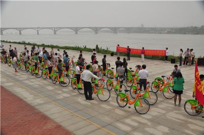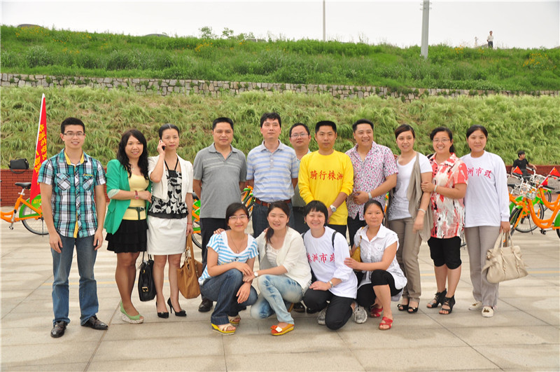 5月10日,美丽的湘江风光带航模广场,一排排动力株洲公共自行车在阳光下格外耀眼,车上鲜艳的国旗随风飘扬。株洲市委党校2012年第二期县干班全体学员聚集一起,在我司建设的风光带自发组织“关爱绿色、保护环境”骑行风光带树木认养活动。