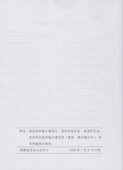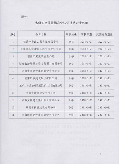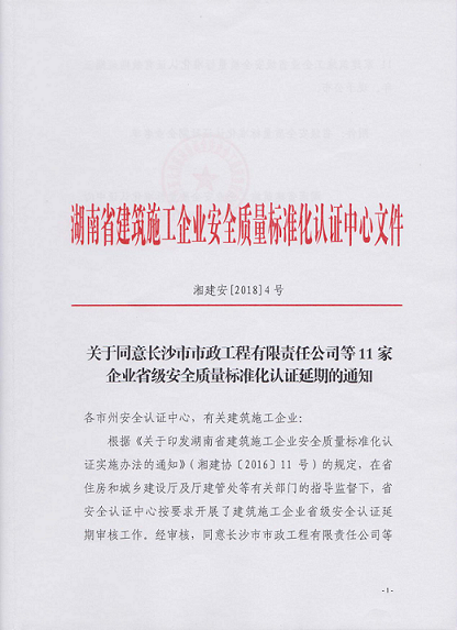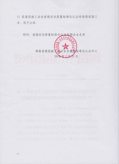 近日,湖南省建筑施工企业安全质量标准化认证中心发文通知(湘建安【2018】4号),湖南国信建设集团股份有限公司顺利通过认证延期审核,省级安全质量标准化认证延期三年。