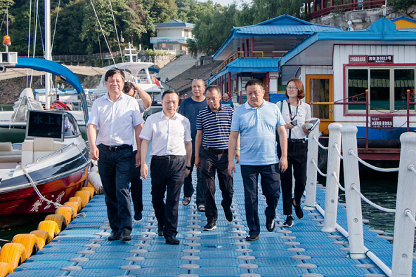 首先,刘家文一行在酒仙湖景区寒婆坳码头现场考察了酒仙湖景区新旧游船更换问题、通航环境和工作难点、监管的特殊性进行实质性了解。随后,根据现场考察情况,酒仙湖公司组织召开了调研专题座谈会,公司董事长易大友就景区水上航运情况进行了详细汇报,并分析了目前景区水上航运所遇到的问题和困难。在座谈会上,刘家文充分肯定了酒仙湖景区的水上航运、便民服务以及施工水域安全监管工作,重点强调了酒仙湖景区要认真落实安全生产主体责任,严格责任分解,确保水上运输安全。同时,对酒仙湖景区的老旧船舶更换与年检、新船运营批复、码头新建、建立船员培训基地、景区夜游项目批复、综合执法等相关重点工作,进行了指导和安排。