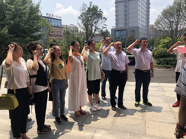 下午,大家在平江起义纪念馆门前重温入党誓词,回顾平江起义这一光辉历史。1928年7月,彭德怀同志率领的国民革命军湖南陆军独立五师第一团和第三团三营驻扎平江,在南昌起义和秋收起义的感召下,在天岳书院发动了平江起义。平江起义有力地推动了湘鄂赣边界革命斗争的发展,为创建湘鄂赣革命根据地奠定了基础。