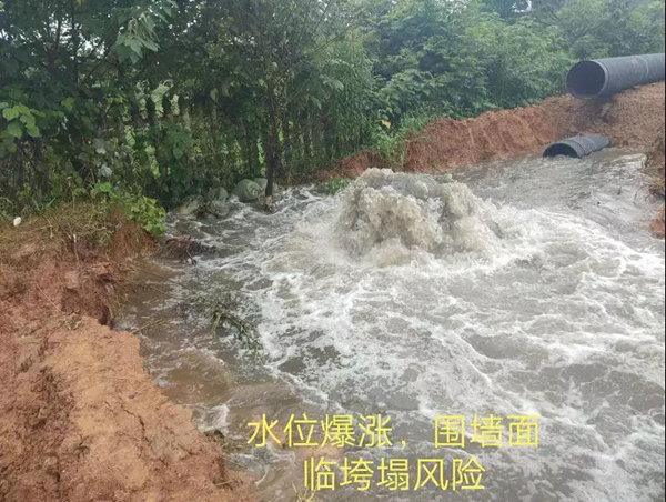 当天值班负责人邓方园,在现场巡查过程中发现场内一出水口水位暴涨,临近的围墙被水流不停冲刷,随时有崩塌的危险,一旦挡墙垮塌,每天几万吨的水将倾泻而下,一墙之隔的道路、田地将毁于一旦,对当地村民的生产生活将造成严重的影响。
