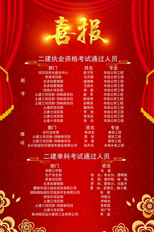 今年公司有80余人参加二建资格考试,随着二建合格分数出炉,公司喜报连连,有16名同志“过五关斩六将”顺利通过二建资格考试,为公司的持续发展再添动力。